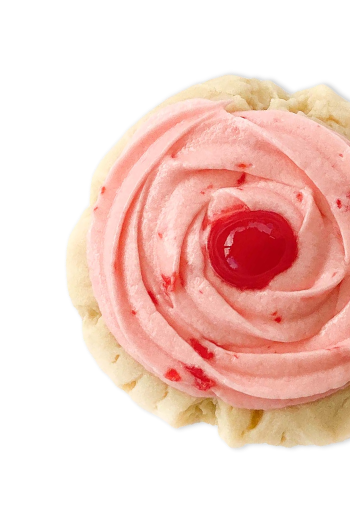 A sugar cookie with white buttercream frosting and sprinkles on top, contains almond extract.